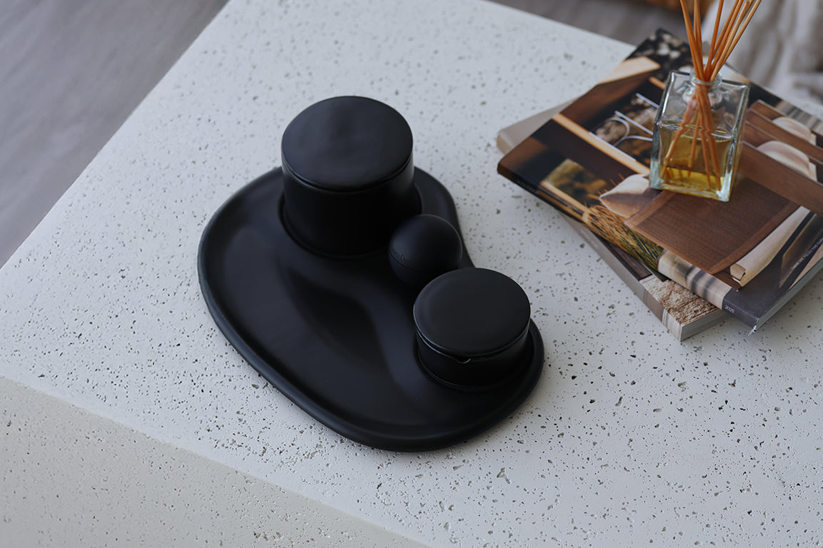 A four-piece tray designed to organize every essential. Crafted from matte-black porcelain, each piece is minimal, functional, and made to elevate any home or lifestyle. Select pieces are dishwasher-safe for effortless cleaning.